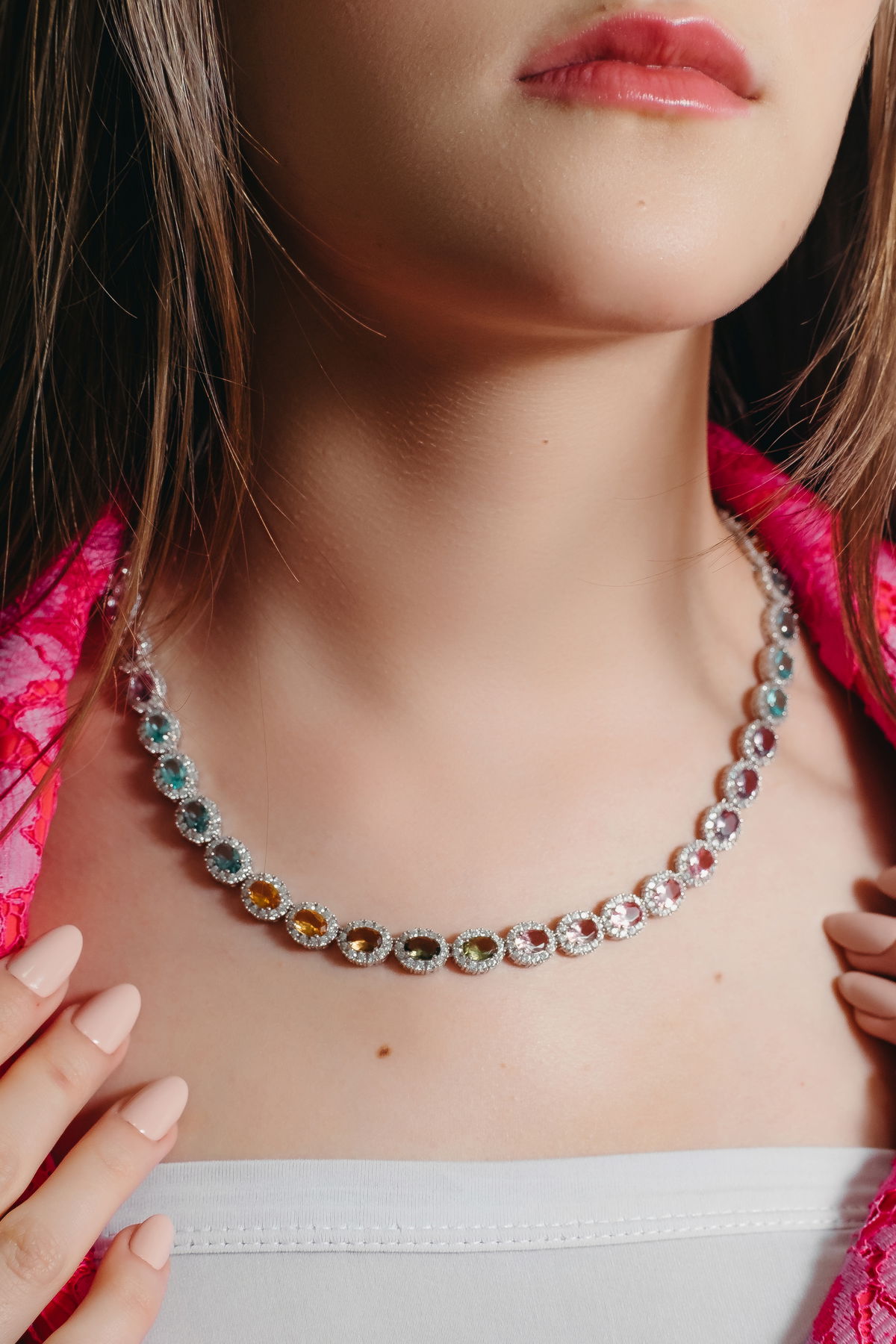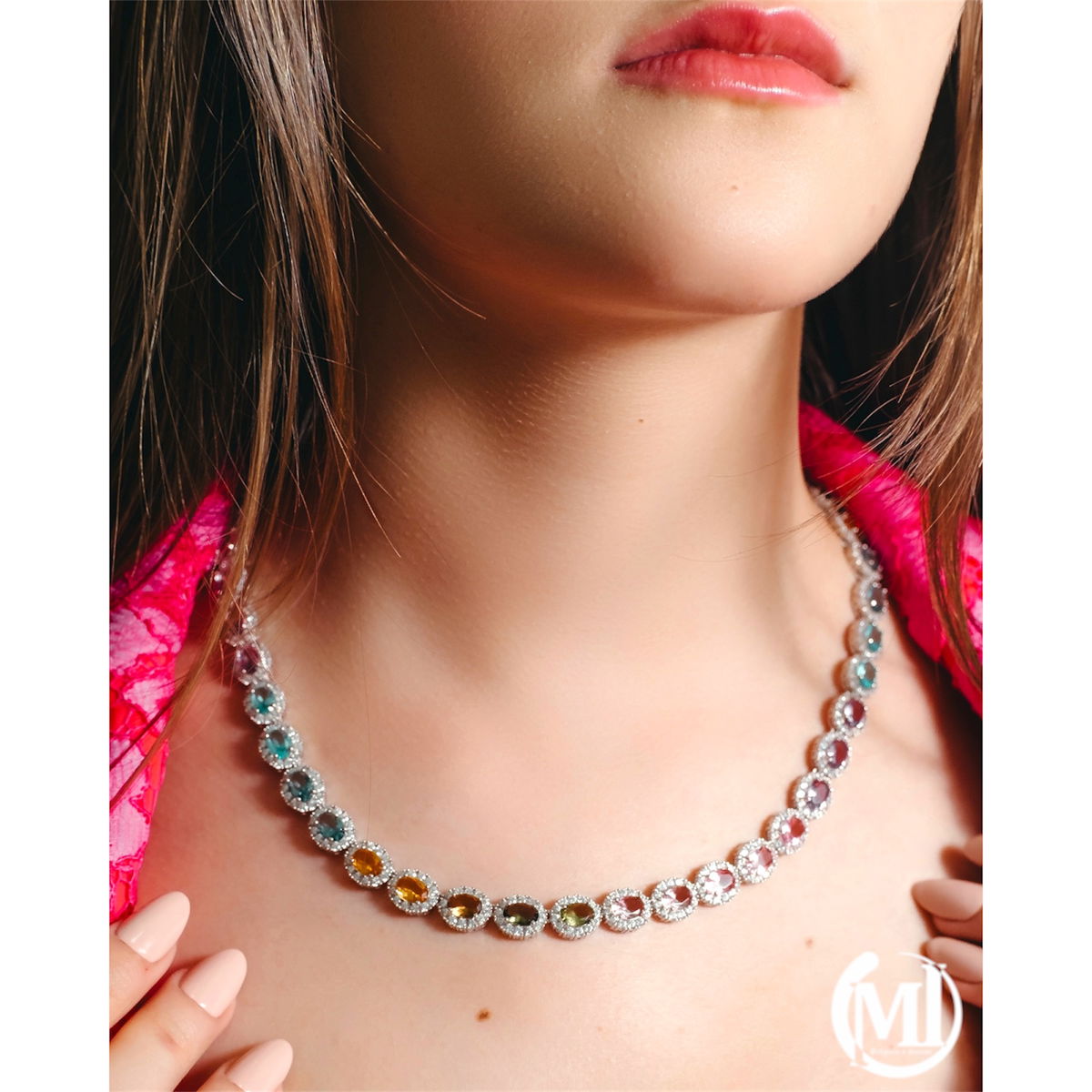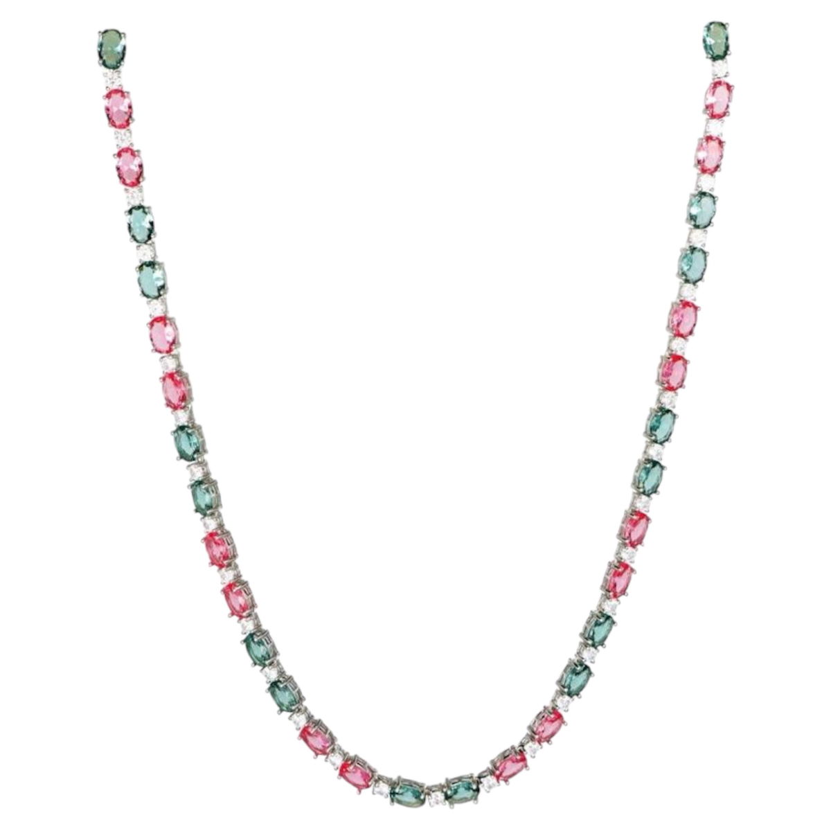 IMPORTANTE GARGANTILLA DE PIEDRAS EN PLATA IMPORTADA 925 CON CUBIC ENGARZADO Y CIERRE DOBLE..