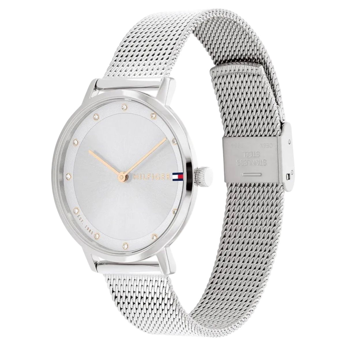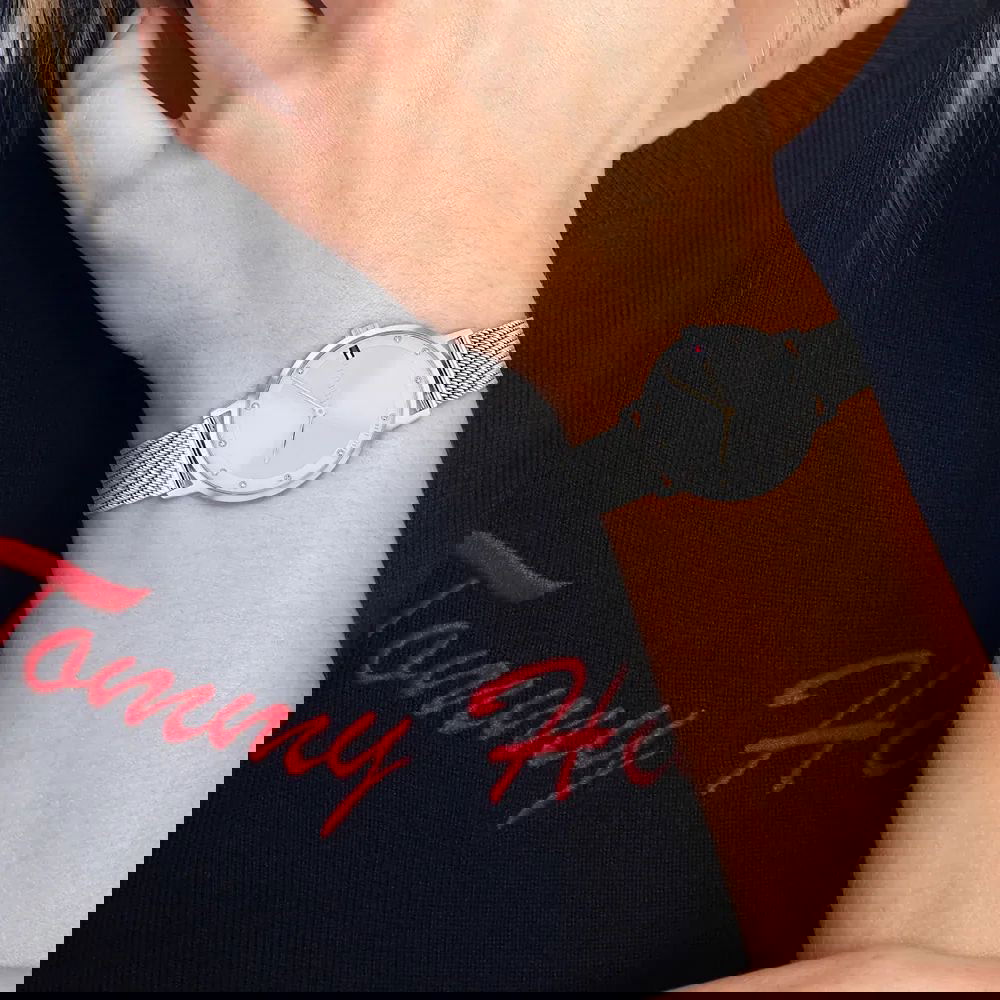Este reloj marca Tommy Hilfiger tiene una caja de Inox con un diámetro de 34 mm y cuenta con una correa de metal. Dentro de la caja se encuentra un mecanismo de Seiko Instruments Inc. de alta calidad el cual esta protegido por un cristal Mineral.