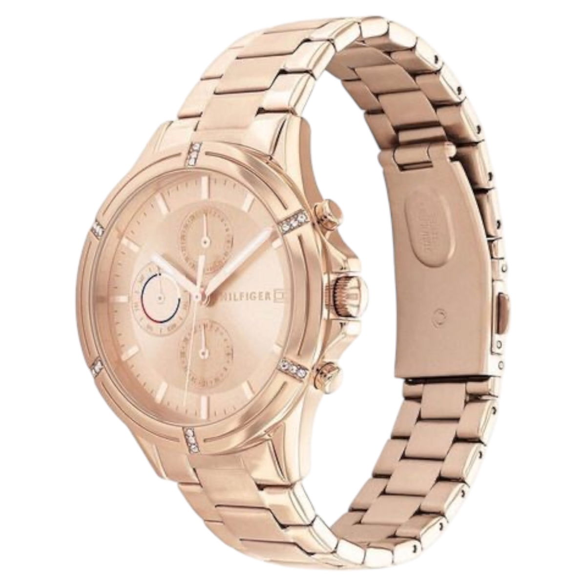 Vístete bien con este reloj Tommy Hilfiger sofisticado y refinado. Los acentos de piedra en el bisel le dan a este reloj el toque perfecto. La esfera de rayos de sol está enmarcada con un anillo reflector cepillado circular y ojos secundarios enmarcados en contraste.